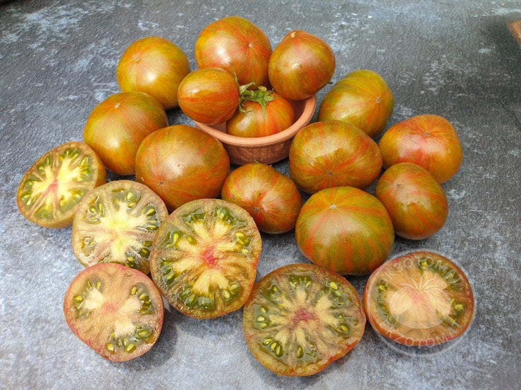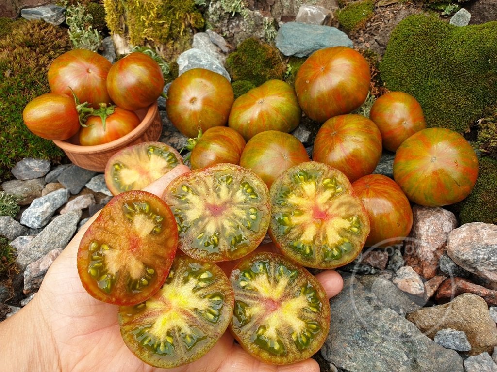6. Цвет томатов: на темно-зеленом фоне проявляются красные и коричневые полосы. Чем дольше плоды зреют, тем темнее (коричневее) становятся. В разрезе зеленые с ярким красным центром.