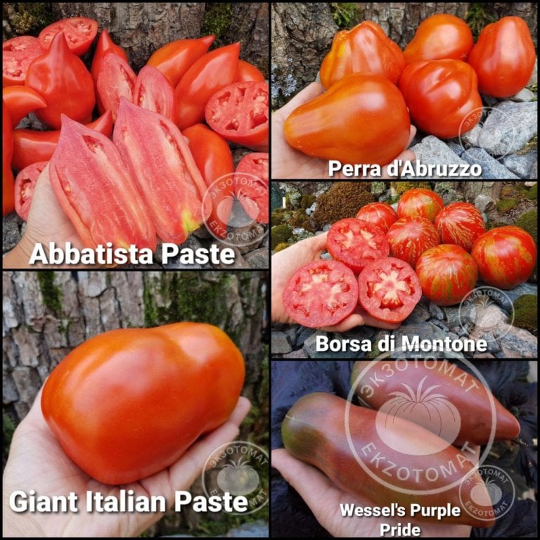 В набор входят 5 высокорослых, мясистых, толстостенных сортов, предназначенных для густых соусов и томатной пасты. Ссылки на названиях сортов ведут на их личные страницы, если нужно узнать подробнее.