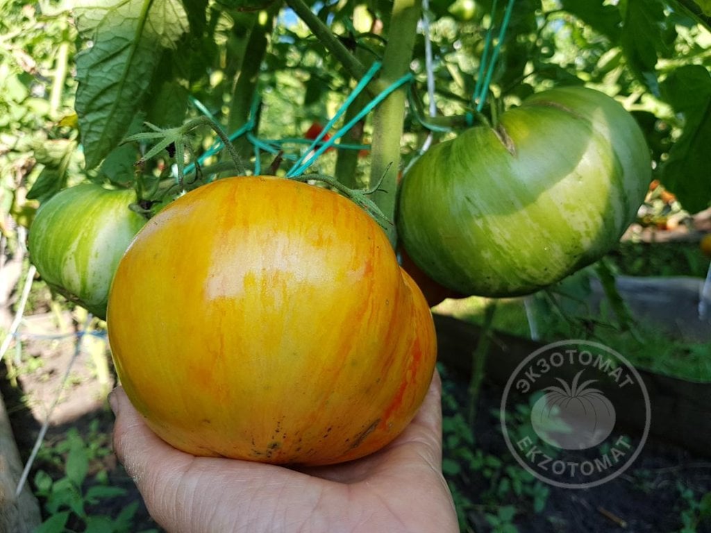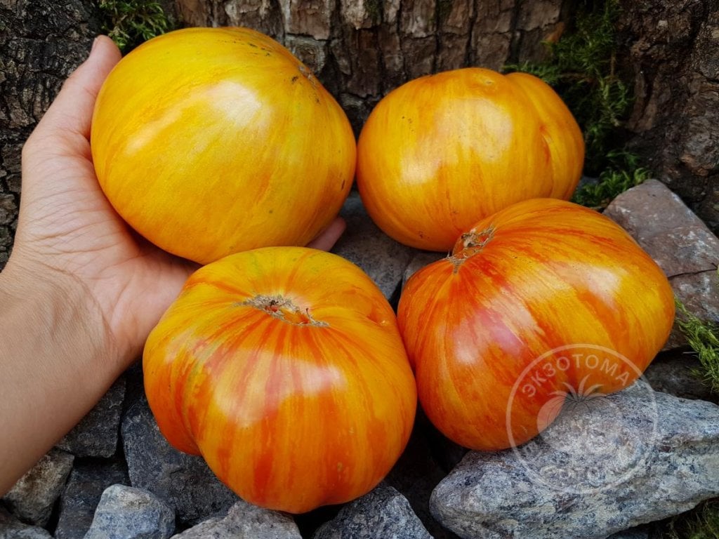 Плоды красивой окраски – на жёлто-оранжевом фоне красные штрихи и полоски. В разрезе мякоть оранжево-красная. Масса плодов 250-300 грамм. По форме приплюснуто-круглые.