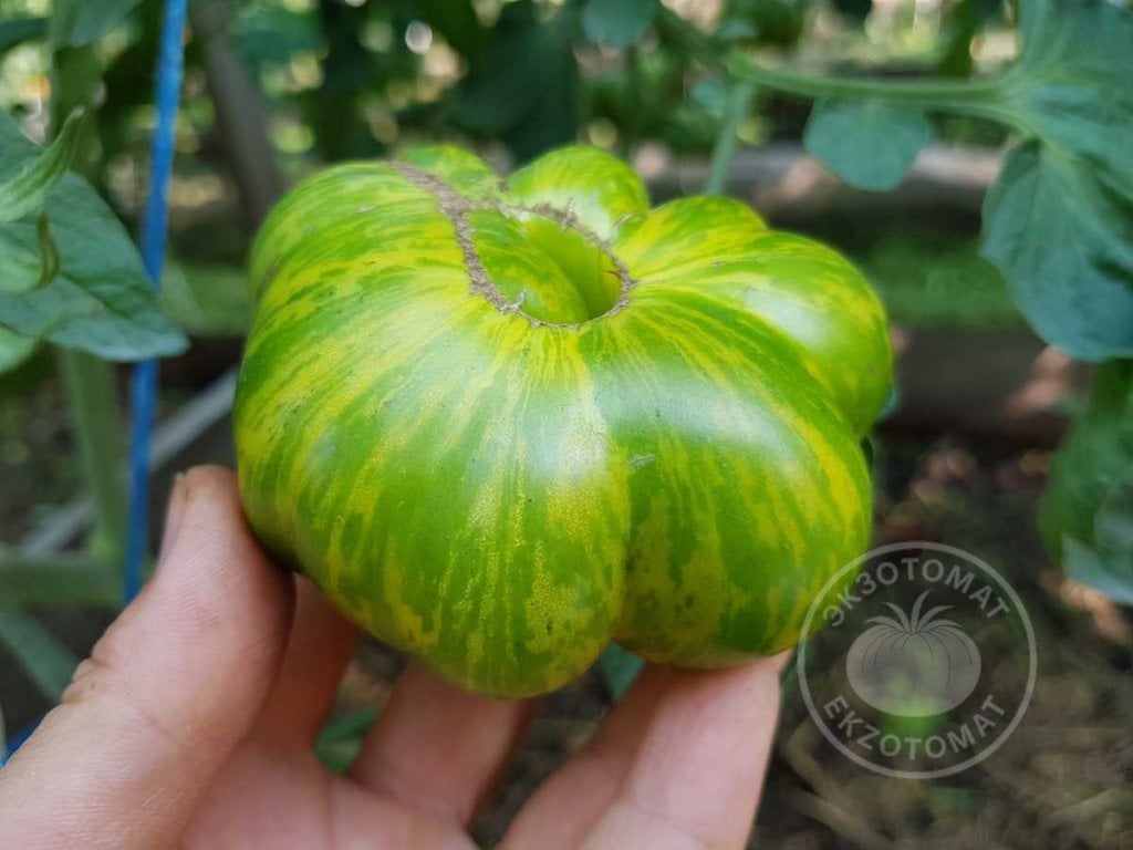 6. Цвет томатов: яркие, красочные, двухцветные плоды - на зелёном фоне проявляются желтые штрихи и полоски. В разрезе мякоть зеленого цвета с более светлыми внутренними стенками.