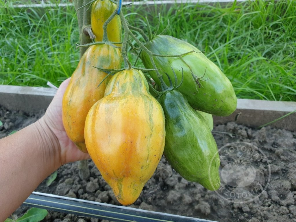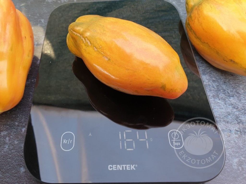 5. Форма и масса плода: форма у томата Жёлтый тюльпан перцевидная, саблевидная, раздутой сливы, иногда с продольными неглубокими ребрами. Масса плодов 100-300 грамм