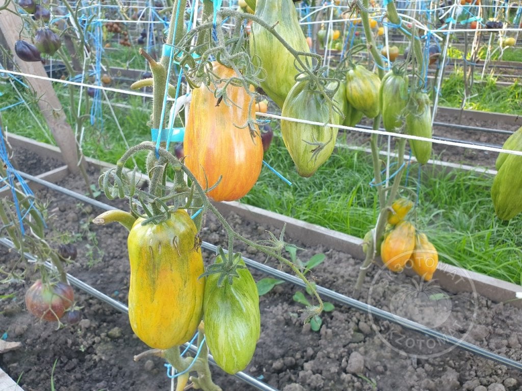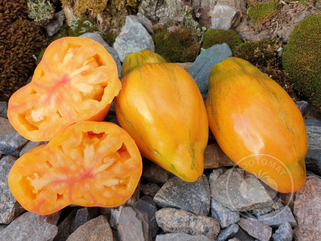 6. Цвет томатов: желто-оранжевые плоды украшены тонкими полосками малинового цвета. Внутри жёлто-медовая мякоть с малиновыми мазками. Красивые, яркие!